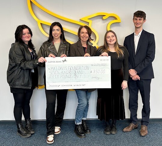 This picture shows Jo Buckingham and Hollie Davis receiving the cheque on behalf of the Mat Davis Foundation, alongside Charity Ambassador Kerren, Community Ambassador Bella and Student Leader Ben.